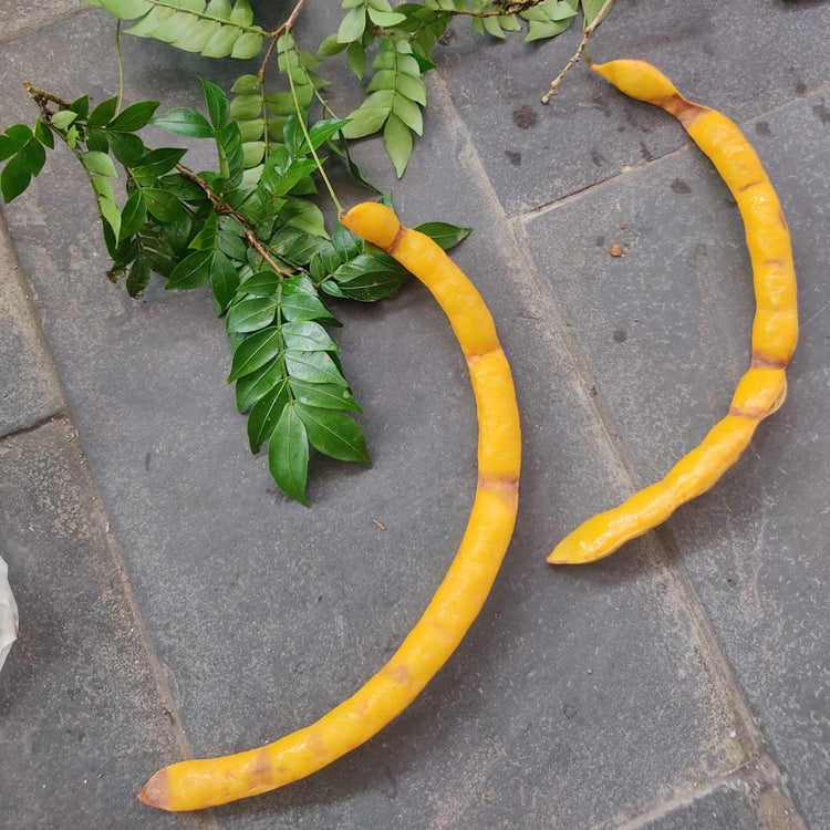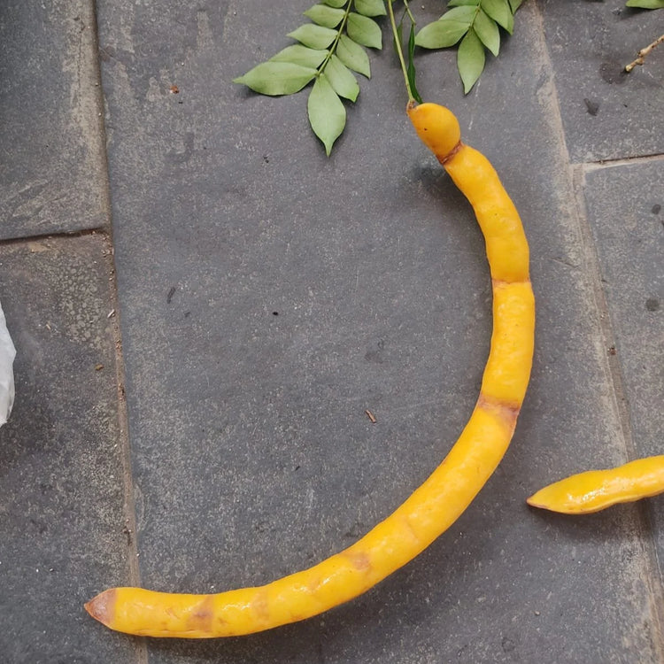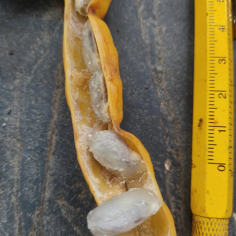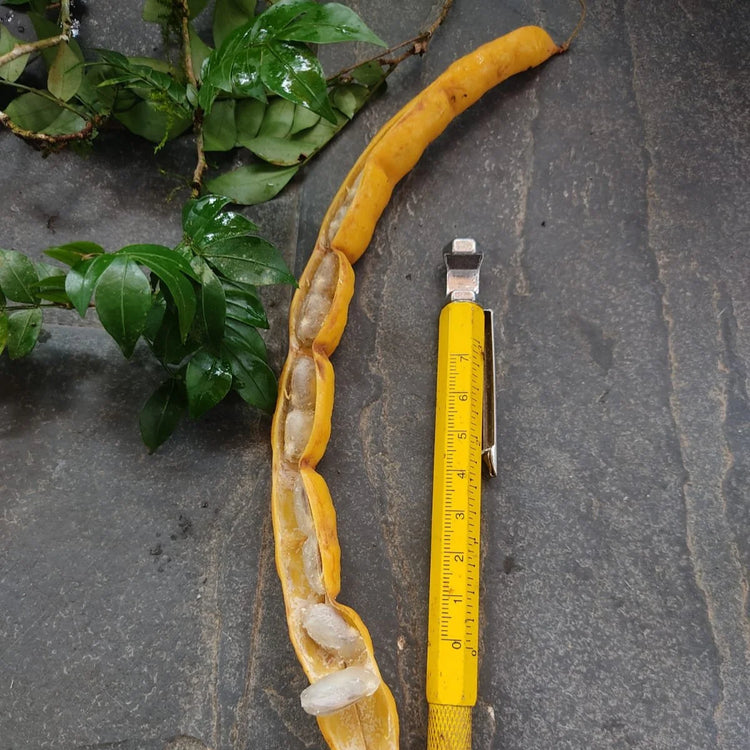 Inga sp. penduculata is a small to medium-sized tree, typically reaching a height of around 8 meters.The tree is native to the Atlantic Forest region of Uruçuca, Bahia, Brazil. It is adapted to and thrives well in tropical, humid environments with rich, well-drained soils, often contributing to soil health through nitrogen fixation. It is a remarkable and highly unique species within the large Inga genus, particularly noted for its distinctive fruit coloration.This species is notable for its long, thin, bright yellow pods, which stand out significantly from the more common green or brown varieties found in most other Inga species. The fruits contain a sweet and flavorful white pulp, making them a valued edible species.