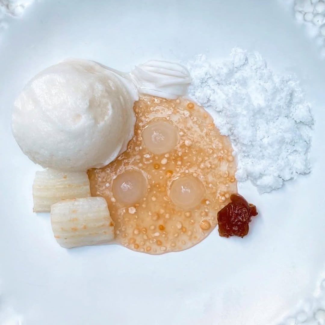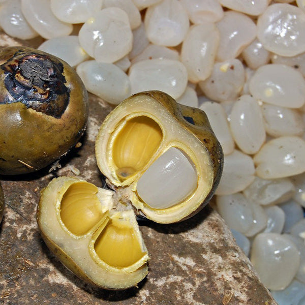 The sugar palm fruit, also known as ice apple or Palmyra fruit, is a tropical fruit with a tough, black outer shell and edible, translucent, jelly-like seed kernels that are similar to lychees in texture and taste. The fruit is native to Southeast Asia and the Indian subcontinent, where it is a popular ingredient in desserts and sweet drinks,